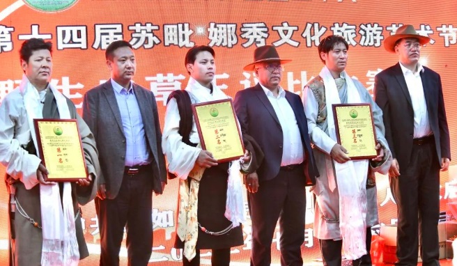 經(jīng)過評(píng)比,茶曲鄉(xiāng)茶久的蟲草以整體質(zhì)量最佳獲得蟲草鮮草單斤第一名,第二名和第三名則是來自茶曲鄉(xiāng)的曲嘎和夏曲鎮(zhèn)的羅杰;獲得蟲草陳草單斤第一名的是來自達(dá)塘鄉(xiāng)的貢嘎,達(dá)塘鄉(xiāng)的索朗達(dá)杰榮獲第二名,茶曲鄉(xiāng)的措白為第三名,出席領(lǐng)導(dǎo)為獲獎(jiǎng)選手頒獎(jiǎng)。
